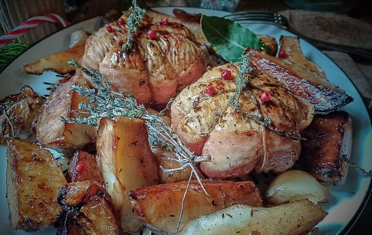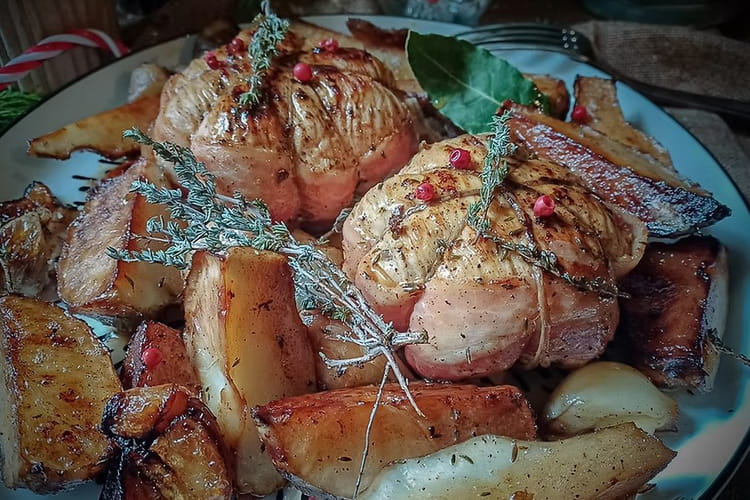 Dressez les melons de dinde farcis sur un plat de service entourés des quartiers de topinambours, ou servez directement à l'assiette.