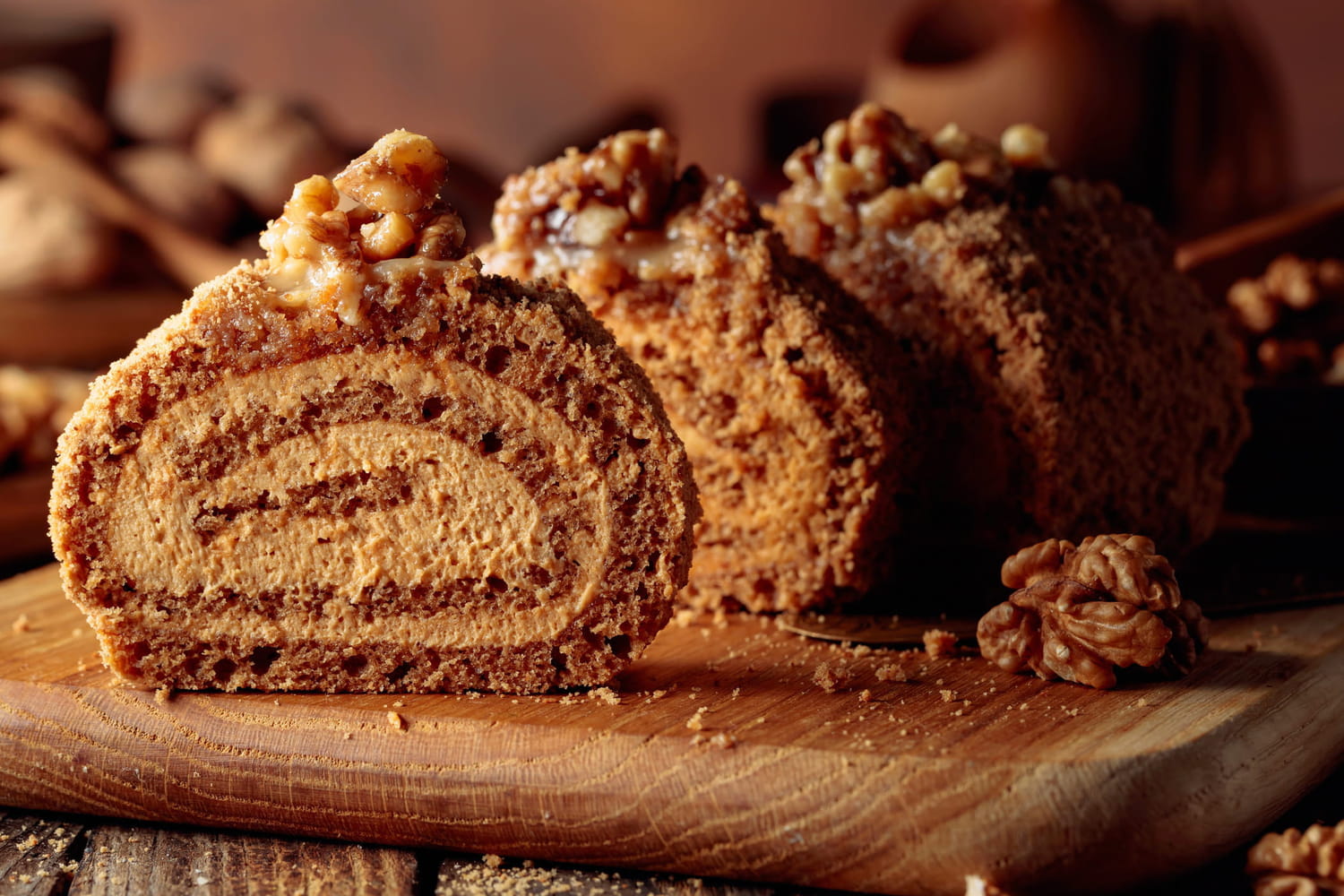 Décorer et laisser reposerParsemer de morceaux de noix sur le dessus pour un joli contraste croquant. Placer au frais au moins 3 heures pour une bûche bien prise.