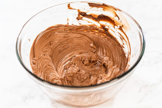 Ajouter le chocolatIncorporer le chocolat fondu refroidi et le cacao, puis fouetter pour obtenir une crème homogène.