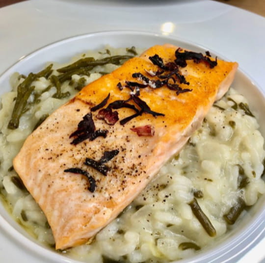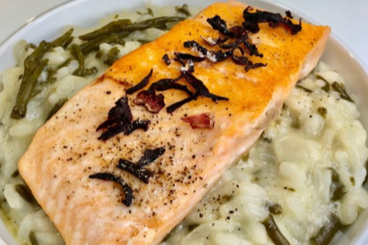Pavé de truite snacké sur son lit de risotto aux salicornes