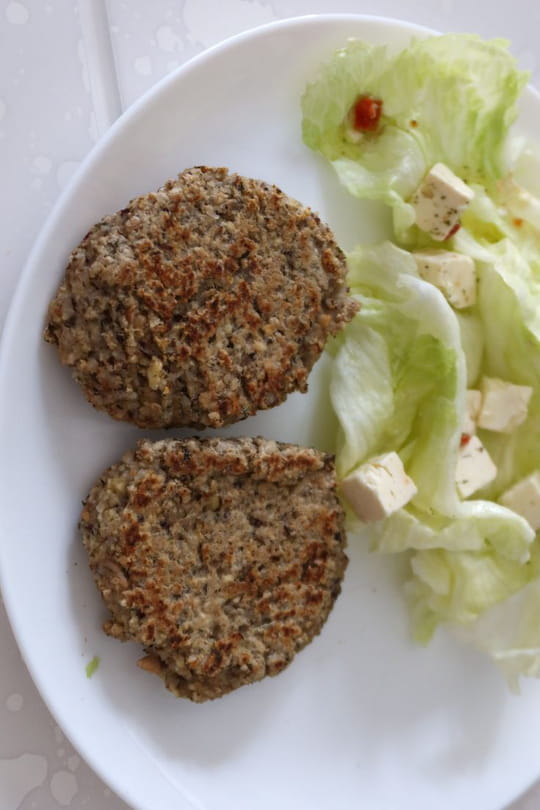 Cuisson des steaksFormer 2 steaks avec la pâte obtenue et les cuire 2-3 min par face dans une poêle bien chaude.