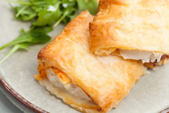 Préparer les feuilletésPréchauffer le four à 180°C. Découper quatre rectangles dans la pâte feuilletée, les déposer sur une plaque recouverte de papier sulfurisé. Replier légèrement le bord, puis badigeonner avec le mélange d’œuf, jaune et eau. Cuire une douzaine de minutes jusqu’à obtenir une jolie coloration.
