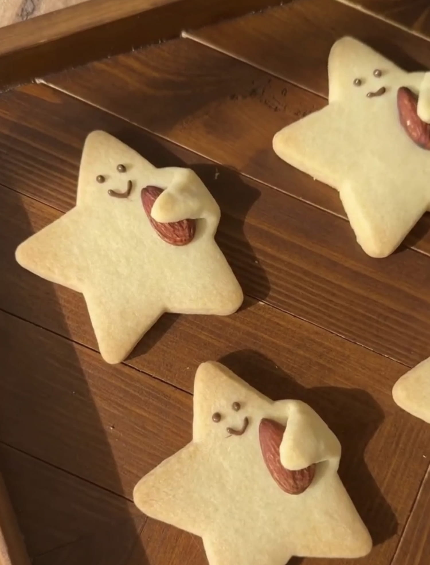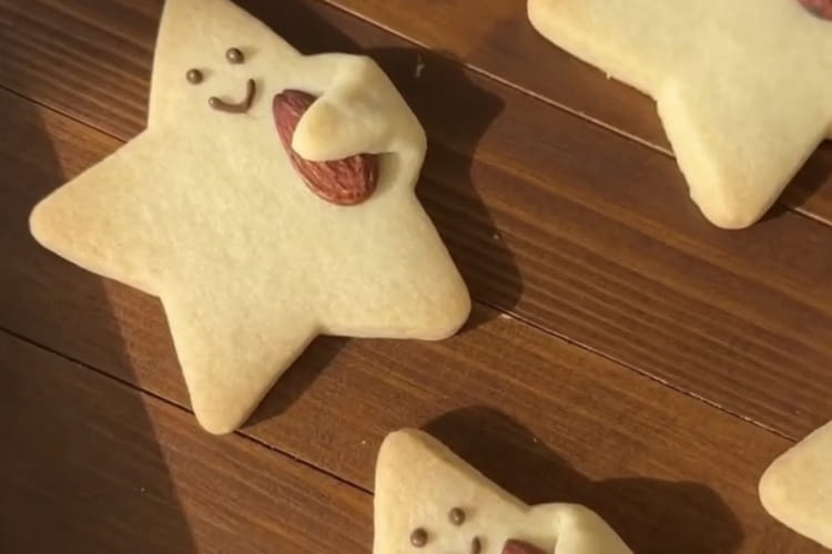 Placez une amande crue et non salée au centre de chaque étoile, puis rabattez une branche de l’étoile pour couvrir partiellement l’amande. -