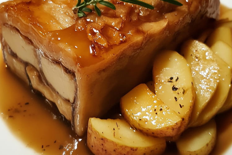 Montage de la terrinePréchauffez votre four à 150°C (300°F). Beurrez légèrement une terrine. Disposez une couche de foie gras au fond de la terrine, puis ajoutez une couche de pommes caramélisées. Répétez l’opération en alternant les couches de foie gras et de pommes jusqu'à remplir la terrine. Terminez par une couche de foie gras.