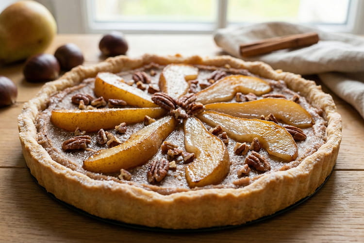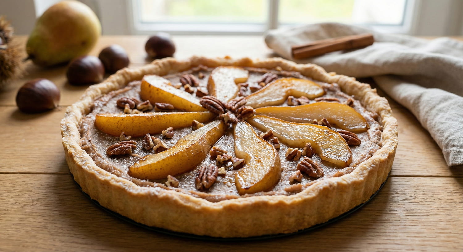 Tarte rustique aux poires, crème de marrons et pécans rôtis