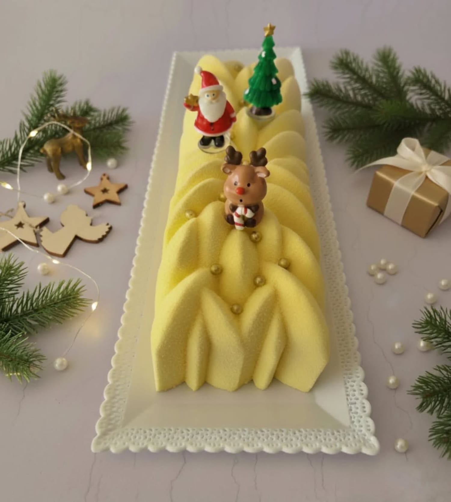 Une bûche fraîche et élégante mêlant l'acidité du citron et du yuzu, la douceur d'une ganache montée au chocolat blanc et le croquant fondant d'un sablé breton.