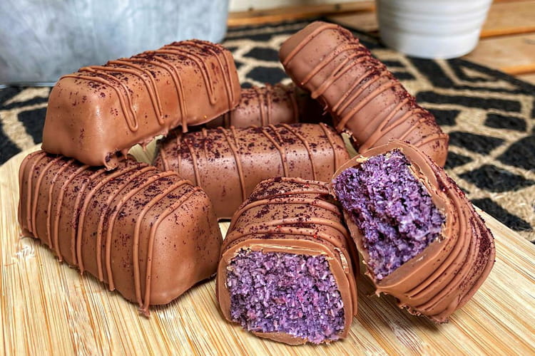 Une version revisitée et fruitée du célèbre bounty : fondant coco, douceur du sucre de coco et une touche acidulée de myrtille, le tout enrobé de chocolat au lait.