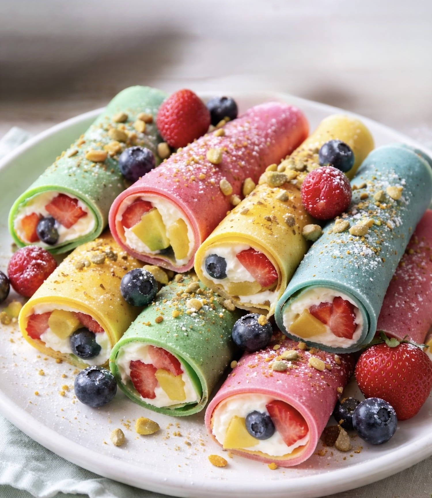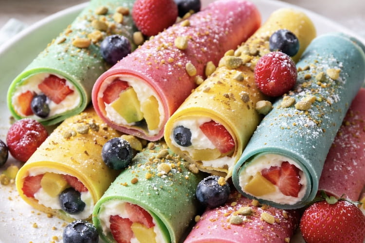 Crêpes arc-en-ciel roulées, garnies de crème vanillée onctueuse et de fruits frais. Une recette colorée, facile et parfaite pour régaler les enfants.