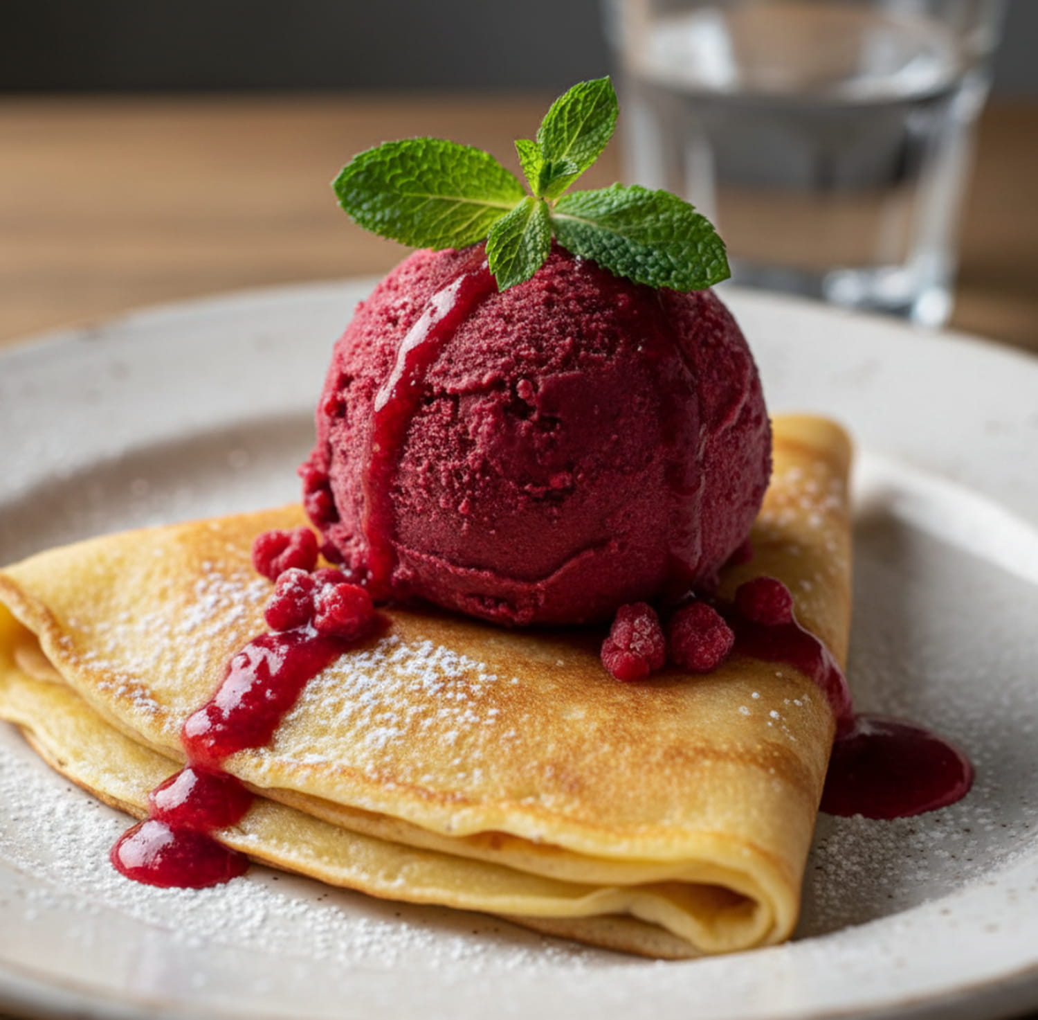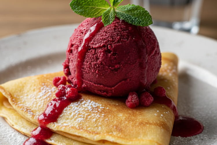 Servir et déguster !Déposez une boule de glace sur une crêpe encore un peu chaude. Régalez-vous ! Vous pouvez ajouter une feuille de menthe et/ou de basilic pour la déco et amener un contraste de saveurs.