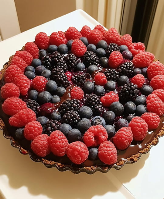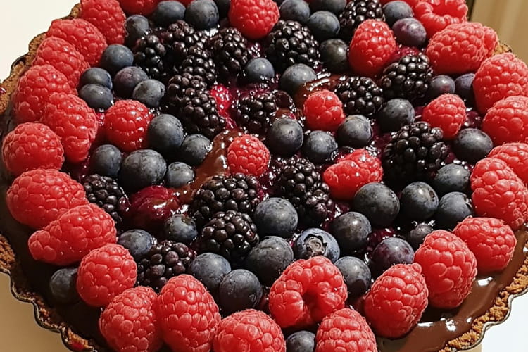 Tarte crue au chocolat et fruits rouges : un dessert sans cuisson à base d'amandes, noix de cajou et dattes. Une recette gourmande, facile et riche en saveurs.