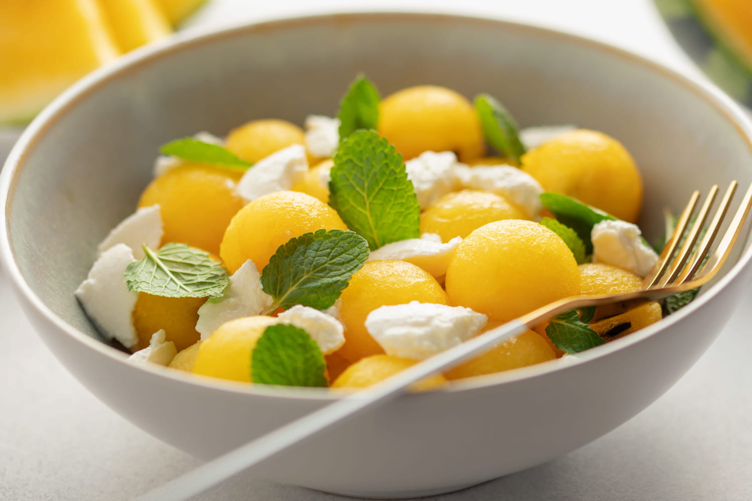 Mélanger le melon et la fetaDans un saladier, déposer le melon et la feta. Ciseler finement les feuilles de menthe fraîche par-dessus.