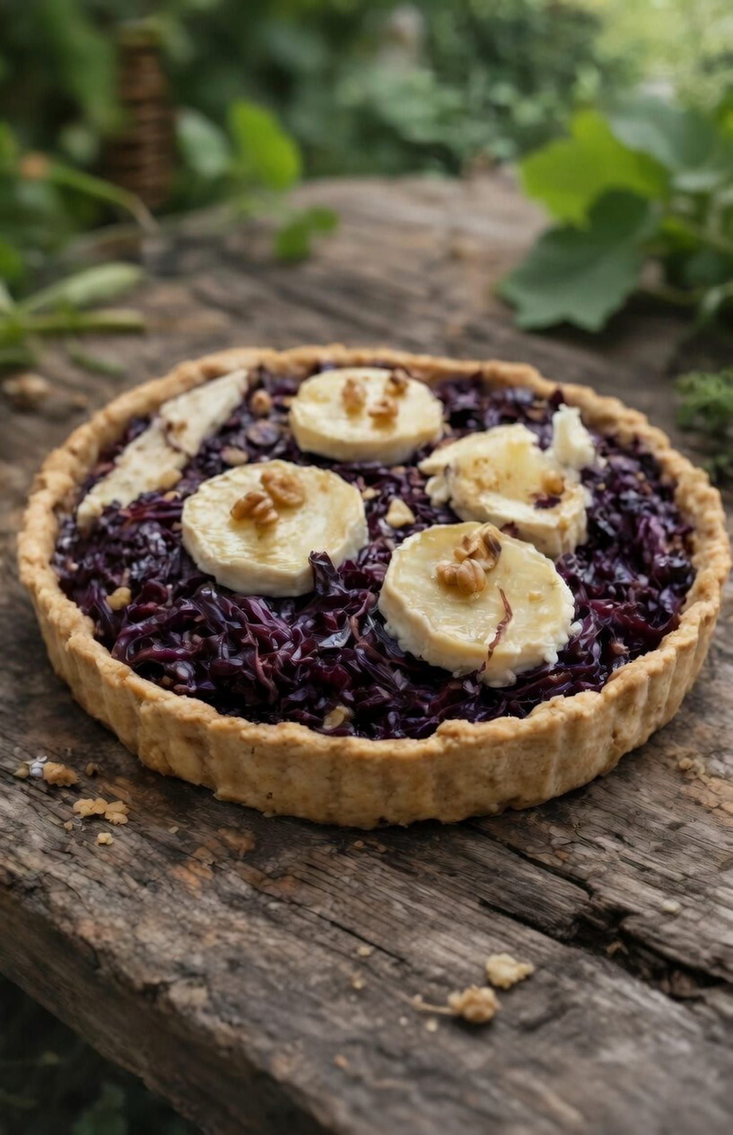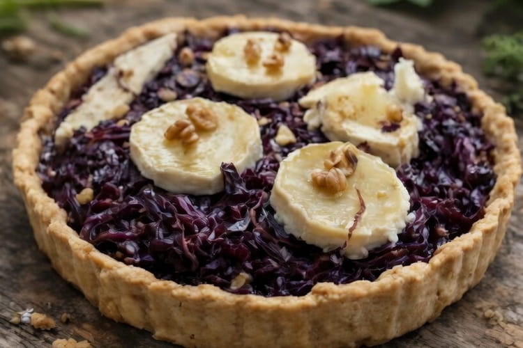 Le chou rouge fondant se marie à merveille avec le chèvre crémeux et le croquant des noix. Une tarte rustique végétarienne pleine de caractère.