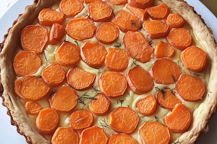 Constituer la tarte :Déroulez la pâte brisée et placez-la dans un moule à tarte. Piquez le fond avec une fourchette pour éviter qu’elle ne gonfle pendant la cuisson. Étalez uniformément le mélange de carottes et d’oignons sur la pâte. Versez l’appareil à quiche par-dessus, en lissant la surface avec une spatule.