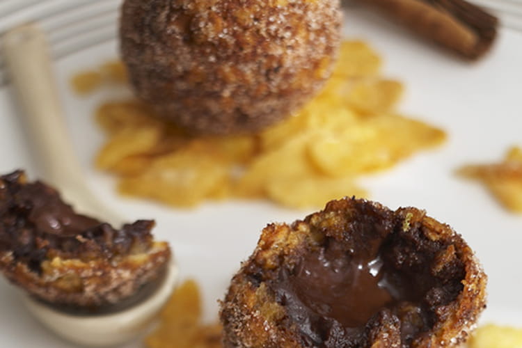 Casser les œufs et les fouetter en omelette avec 20 g de sucre. Les verser dans un plat creux. Concasser grossièrement les pétales de maïs. Mélanger le sucre restant avec les épices. Prélever l’équivalent d’une grosse noix de ganache au chocolat. Lui donner la forme d’une boule et la rouler dans les œufs puis dans les pétales. Bien appuyer pour fixer les pétales. Recommencer 2 fois les opérations (œufs + maïs). Réserver au congélateur pendant 1 à 2 h puis faire frire pendant 4 minutes à 180°C. Égoutter dans un papier absorbant et saupoudrer du sucre épicé. Servir immédiatement.