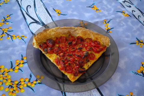 - 4 Prenez vos tranches de tomates et garnissez votre pâte avec. Conseil pour la présentation : mettez-les de manière à ce que, toute recouverte, votre tarte soit un tourbillon de tranches de tomates.