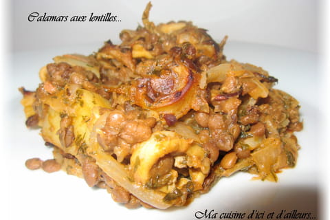 - 3 Dans une autre casserole, faites revenir l'oignon dans l'huile d'olive à feu moyen. Ajoutez les calamars, les pommes de terre, la tomate, le persil et l'aneth. Salez et poivrez. Mouillez avec le vin blanc. Laissez mijotez 30 minutes.