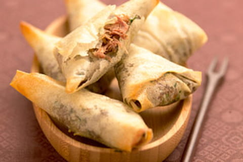 - 5 Etaler une feuille de brick. Déposer au centre une cuillère à soupe de préparation. Rabattre les côtés vers le centre puis replier la bande en quinconce afin d’obtenir un triangle. Renouveler l’opération jusqu’à épuisement de la préparation. Mettre les bricks sur la plaque de cuisson.