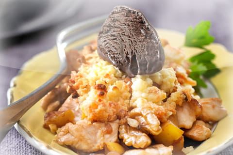Découvrez la recette de Crumble de poulet et crème glacée chocolat.