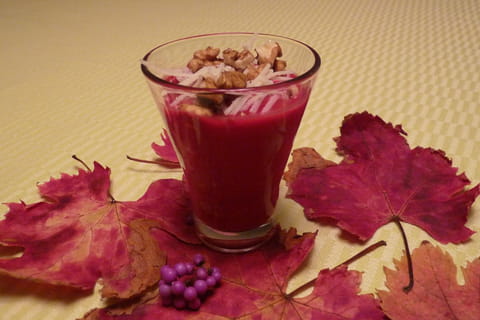 Pour finirDécorer avec des bâtonnets de pommes citronnés ou des brisures de noix. Conserver au frais durant plusieurs heures. Déguster en amuse bouche ou en inter plat.