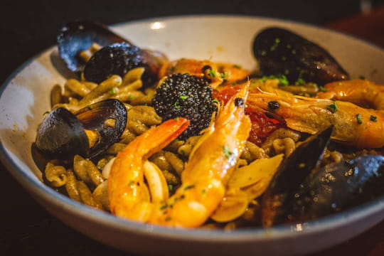 Préparer la sauce crémeuse aux fruits de merDans la même poêle, faire fondre une noisette de beurre. Ajouter l’échalote finement hachée et faire revenir 2 minutes. Déglacer avec le vin blanc et laisser réduire 2 minutes. Incorporer la crème fraîche, puis la maïzena diluée dans 2 c. à s. d’eau froide. Saler, poivrer, remettre les fruits de mer et laisser épaissir 5 minutes à feu doux.