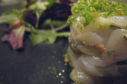Découper finement les noix de saint jacques au couteau ainsi que le céleri, le concombre et les olives vertes en brunoise. Ajouter le gingembre en poudre, le sel, le poivre et la ciboulette ciselée finement. Mélanger délicatement le tout. Pour la présentation, poser un petit cercle à pâtisserie dans une assiette et le remplir de tartare. Retirer le cercle et parsemer chaque petit tartare de zeste de citron vert pour la décoration.
