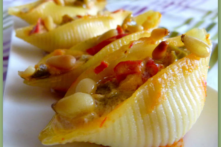 Les célèbres pâtes coquillage italiennes farcies avec des poivrons et le fameux brocciu corse.