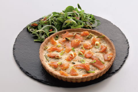 - 2 Émincez 2 poireaux et faites-les revenir dans une poêle avec un peu de beurre. Lorsqu’ils sont fondus, ajoutez 4 cuillères à café de crème fraîche, puis assaisonnez. Étalez les poireaux sur la pâte puis ajoutez 130g de saumon fumé ‘pour mes recettes’ Delpierre coupé en lanière.