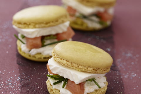 Écrasez la moitié du caprice des anges dans un bol avec une cuillère d'huile de noisette. Coupez l'autre moitié en petites tranches. Coupez grossièrement les herbes, assaisonnez-les avec l'autre cuillère d'huile. Répartissez le caprice des anges écrasé sur la moitié des coques de macaron. Déposez des morceaux de saumon et un peu d'herbes dessus. Couvrez avec les tranches de caprice des anges et les autres coques de macaron. Conservez au frais jusqu'au moment de servir.